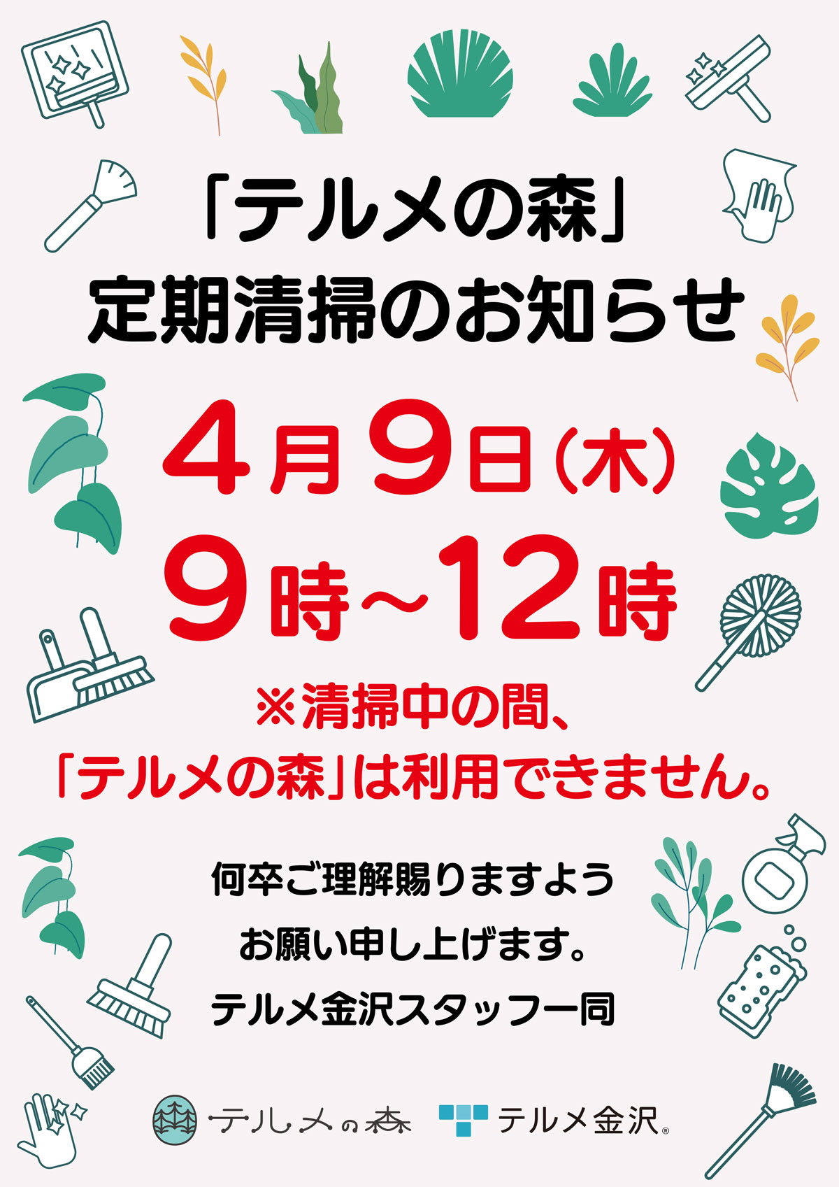 4/9(木)「テルメの森」定期清掃のお知らせ