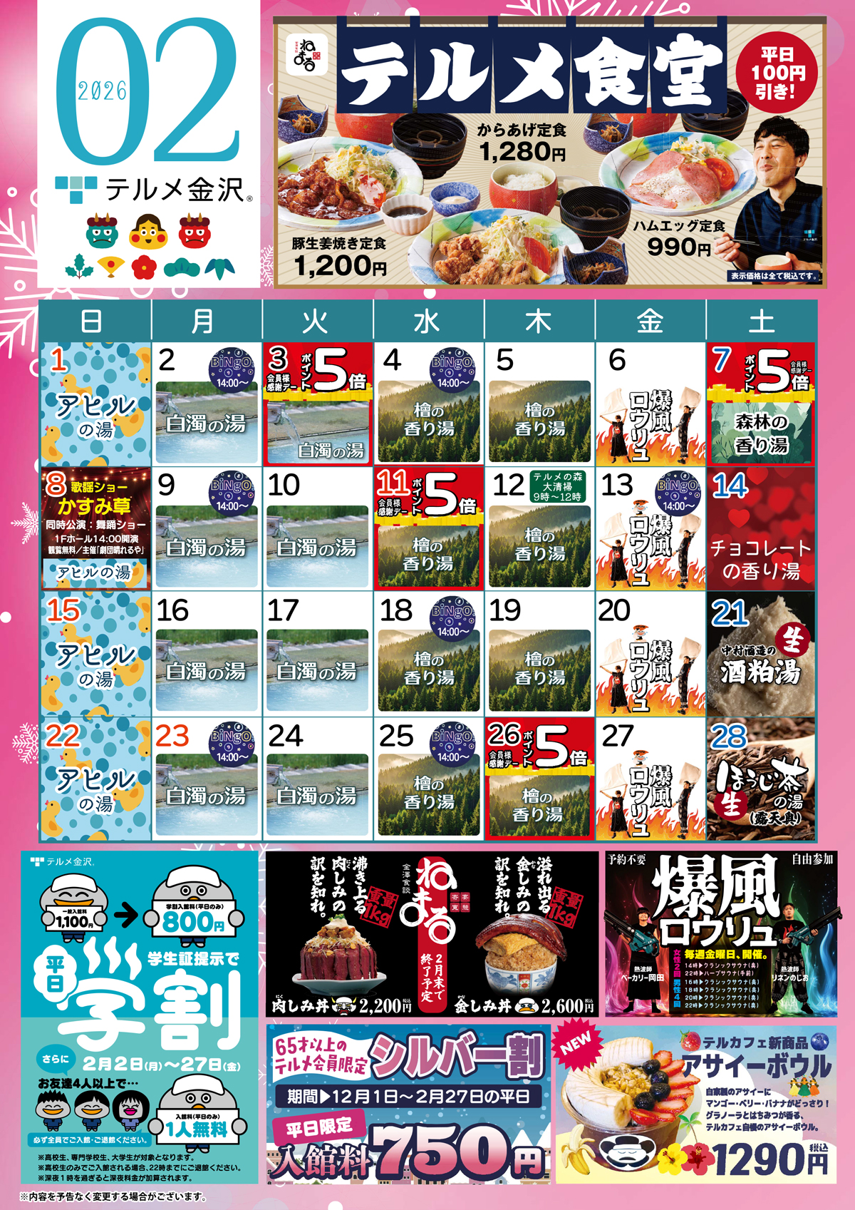 お知らせ一覧 キャンペーン情報一覧 イベントカレンダー >イベントカレンダー>2026年2月のイベントカレンダー 2026年2月のイベントカレンダー 一覧に戻る 2026年01月25日 PDFファイルでもご覧いただけます。 一覧に戻る