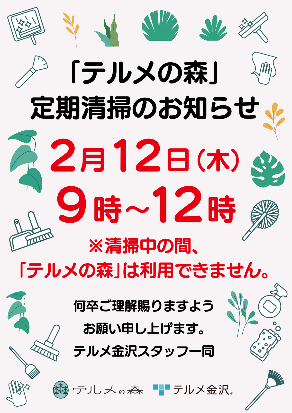2/12(木)「テルメの森」定期清掃のお知らせ