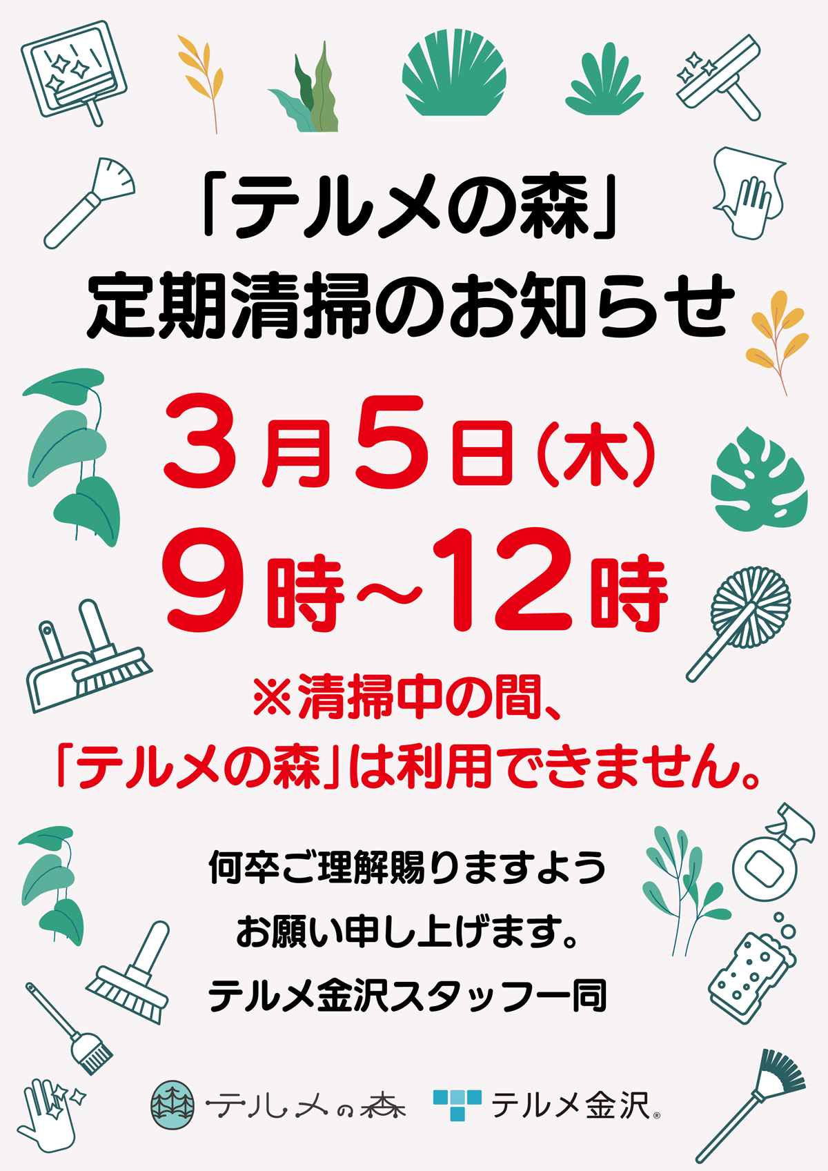 3/5(木)「テルメの森」定期清掃のお知らせ