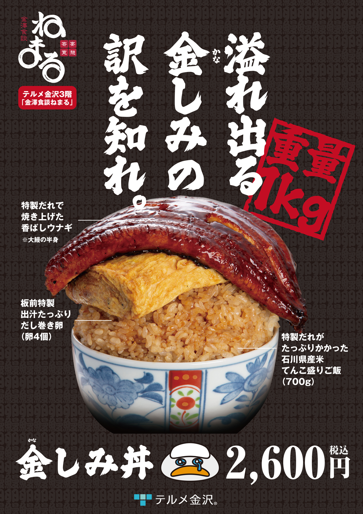 特製だれをたっぷりまとった石川県産米(700g)の上に、香ばしく焼き上げた大鰻と、