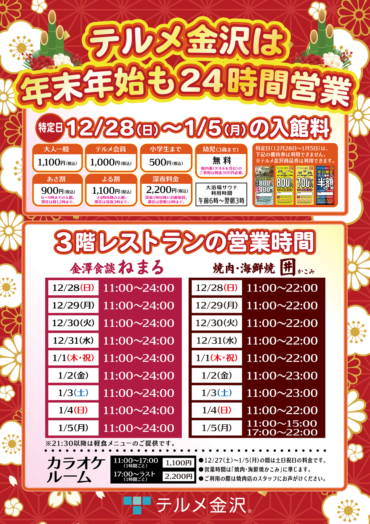 テルメ金沢は、年末年始も24時間営業いたします。