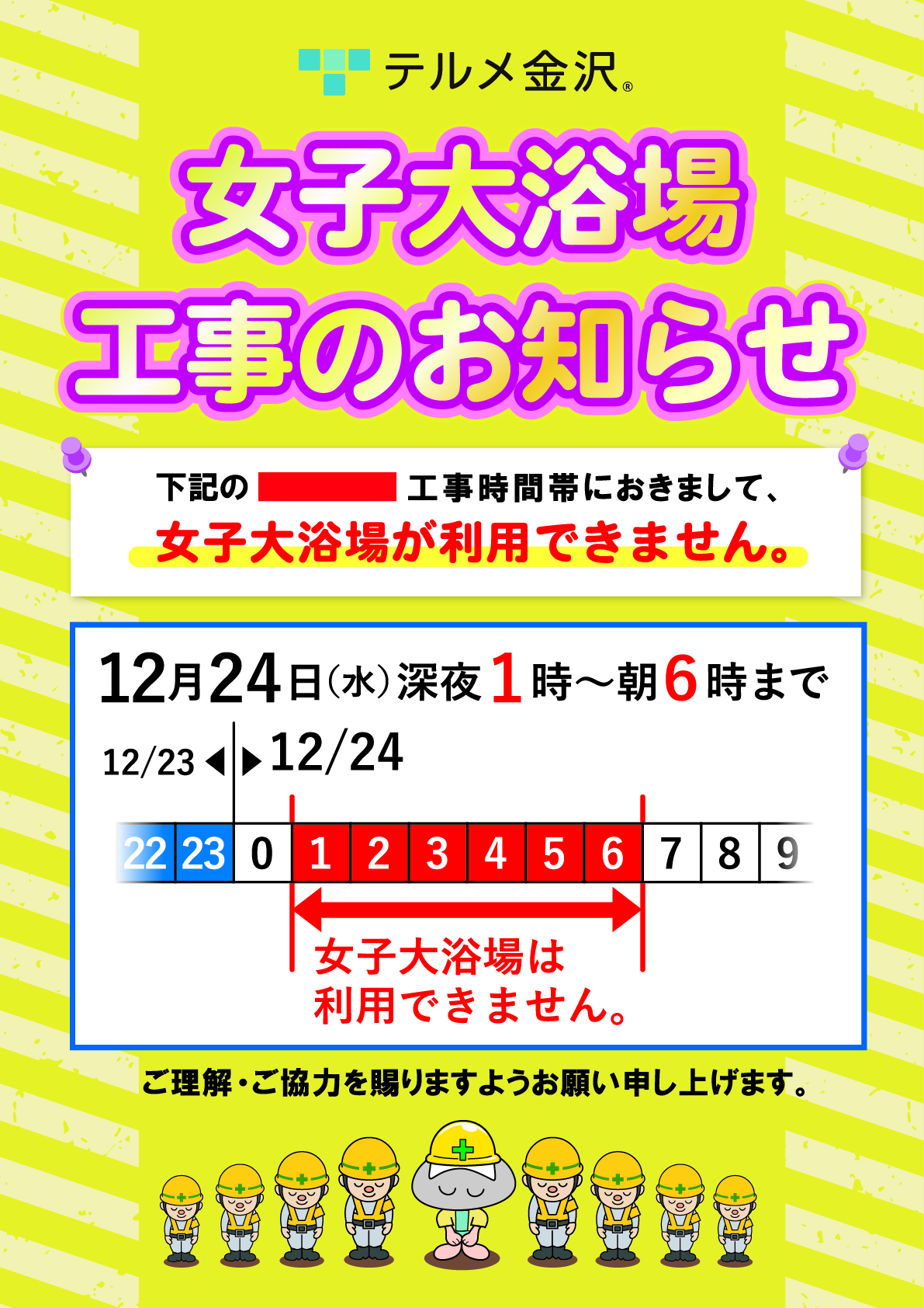 女子大浴場の夜間工事のため、下記期間中はご利用できません。