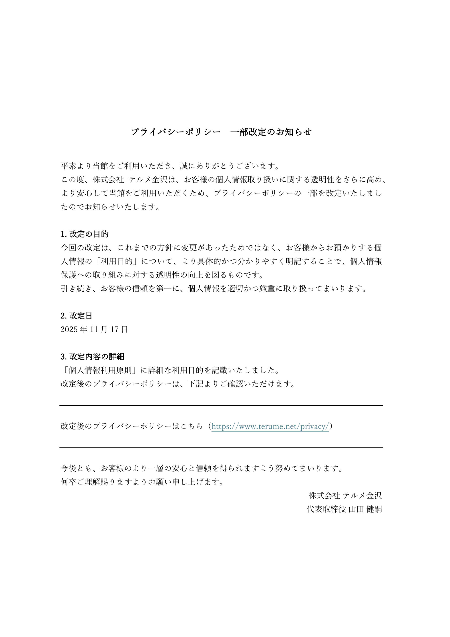 お知らせ一覧 キャンペーン情報一覧 イベントカレンダー >お知らせ一覧>プライバシーポリシー改定のお知らせ プライバシーポリシー改定のお知らせ 一覧に戻る 2025年11月18日 PDFファイルでもご覧いただけます。 一覧に戻る